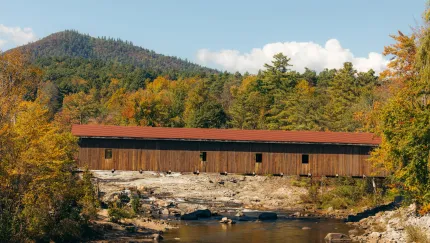 This wooden Howe truss covered bridge spans 175 feet over the East Branch Ausable River in Jay. It was constructed in 1857, completely restored in 2007, and is the sole remaining bridge of its kind in the Adirondacks.