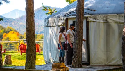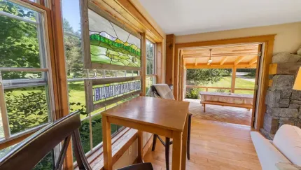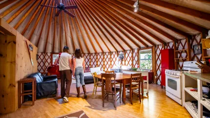 A 30' yurt is tucked into the pines overlooking the pasture with mountain views out across the AuSable Valley. Located in the Jay, it's a perfect base camp for summer hikes, bikes or paddles in the Adirondacks. The yurt is roughly 700 square feet, broken into three main spaces. There is a master bedroom with a queen bed, a smaller bunk room with twin bunks, then a big space with a living room and kitchen area with a table. Outside you'll find a new roofed outdoor kitchen space with a range/oven, gas grill, stainless steel commercial sinks and plenty of space to set up a spectacular meal. Tucked behind the kitchen is a wonderful outdoor shower and a small vanity. There's a fire pit with benches, chairs, and a hammock strung between a couple pines.