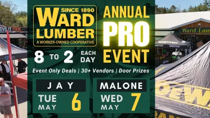 Ward Lumber’s Annual Pro Event is bigger than ever! Join worker-owned Ward Lumber on May 6 from 8:00 a.m. to 2:00 p.m. at their Jay store, and then on May 7 from 8:00 a.m. to 2:00 p.m. at their Malone location! More than 30 vendors will be onsite showing off all the newest products in construction today, with demonstrations and free samples.