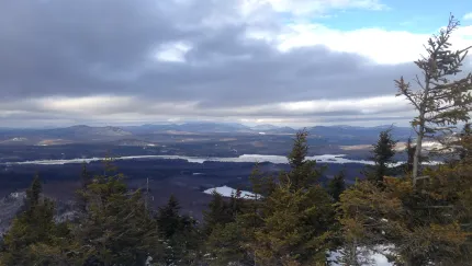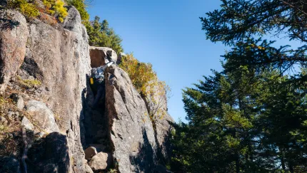 This is a 1.8 mile hike, one way, over moderate to steep terrain. From the trailhead parking area and trail register, you will start hiking on the flat through semi-open terrain with many wild flowers in bloom in season. At 0.6 miles, the trail bears right and begins to climb, dips to cross a brook at 0.8 miles, and then continues a mostly steep climb to the base of a steep chimney at 1.4 miles. This chimney requires some scrambling and may be difficult for small children and dogs or anyone not comfortable on high places. After this short challenging stretch, the open rock summit at the top of the chimney offers good views and is a worthy destination. Past this first summit, the trail briefly dips before resuming a zig-zagging climb across a series of open ledges. The trail is marked with intermittent cairns and fading paint blazes and requires some care to follow before reaching the summit at 1.9 miles.