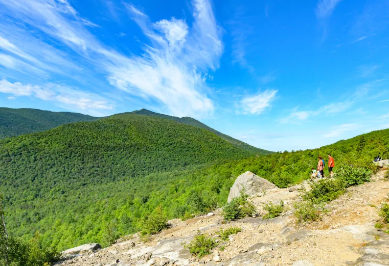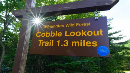 Constructed in the fall of 2014, this trail has become very popular because short hike to a spectacular view of the Ausable Valley and the surrounding mountains. The start is marked by a sign at the highway and with blue markers on the trail itself. Hikers should learn about Leave No Trace principles before hiking any trail in the Adirondacks.