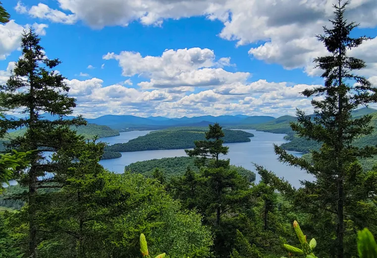 Go to Echo Bay at the northwest corner of Lake Placid and land at the concrete slabs located about the middle of the north shore. A faint trail goes 0.1 mi. to the main trail around the lake. Go right for a few yards and cross a stream to a junction with the side trail up Eagle Eyrie.