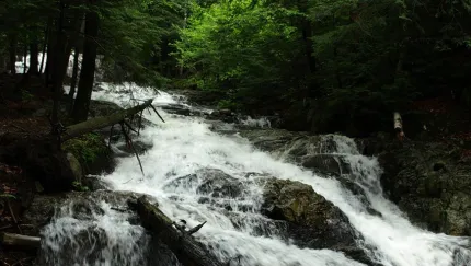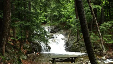 Stag Brook Falls is an excellent hike along a brook with numerous waterfalls and cascades. Picnic benches, nature signs, and swimming are available along the way. When the mountain is open for skiing, hikers are not granted access to this trail.