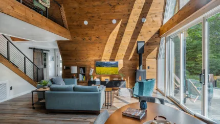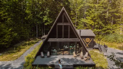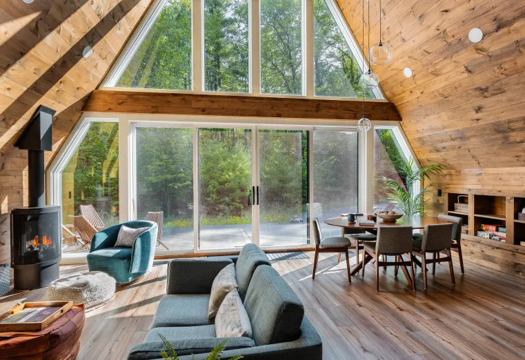 A modern and luxurious mid-century rustic Aframe cabin! Located on a quiet road, this amazing space serves as a woodland retreat for your family to relax in and recharge after adventure filled days hiking, biking, paddling, fishing and skiing amongst the High Peaks of the Adirondacks.