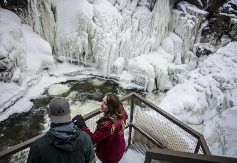 The 0.5 mile Waterfall Walk can be done using traction devices provided by High Falls Gorge. It brings you alongside and over the West Branch of the Ausable River on incredibly scenic footbridges and balconies.