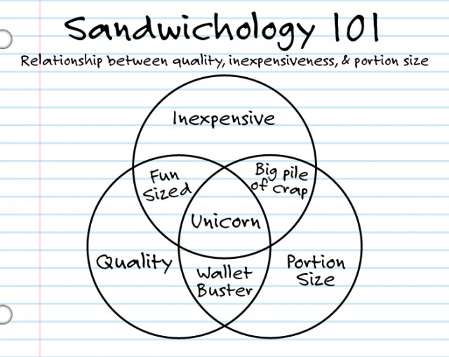 Basic Sandwichology has determined that there are three basic characteristics of all sandwiches: Quality, inexpensiveness, portion-size. Unfortunately, due to the laws of the universe, a sandwich can only occupy two out of the three characteristics. I’ve sketched up a diagram to help.