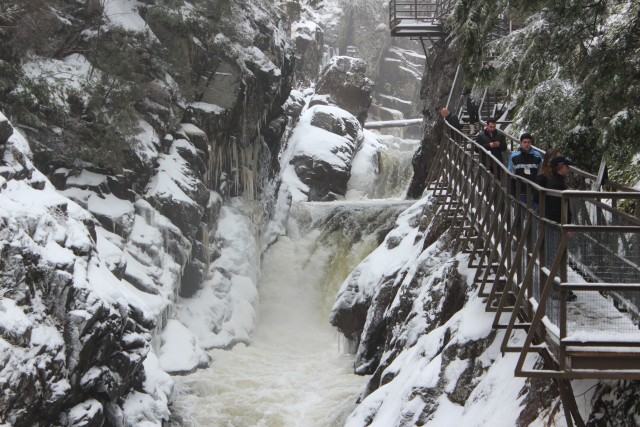 It's a steep climb down a stairway to get to the vantage point, but it's not as daunting as it looks. That's because High Falls Gorge staff provide everyone with traction devices, which stretch over whatever you're wearing on your feet. They're simple, effective devices that facilitate a surprising amount of traction on winter-encrusted surfaces. I recommend trusting the traction and curbing whatever hesitation you have to meet the waterfall head-on. There aren't a lot of places where you can stand face-to-face with such a wonder, and there are few things more awe-inspiring, or humbling, than feeling the breeze and hearing the roar a waterfall of this size creates. It's a thing of power, for sure.