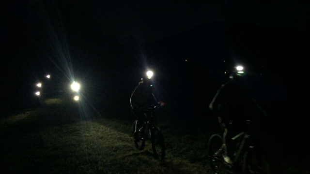By this point in the evening we had pretty much all turned on our lights. Some of us had head lamps, others had actual bike lights hooked to their helmet or handlebars. I recommend getting the bike light and nixing the head lamp approach. The bike lights are a lot brighter allowing you to see more of the trail where as the head lamp isn’t as stable and doesn't light up the trail well — especially when you consider you're traveling at much higher speeds through the woods than a hiker. I have to say I unfortunately still have a headlamp. It’s definitely a challenge. I’d be riding and the light would bounce one way but the trail would go in the other direction so I’d be riding into the unknown and off the trail constantly while having to readjust the light. Don’t get me wrong, riding in the night by light is very exciting. I’ve been riding these same trails all summer in the day ight. However, when you ride at night, the trail becomes unrecognizable. In many ways it's like riding a new trail for the first time! I love looking back and seeing a whole trail of lights gliding through the forest.