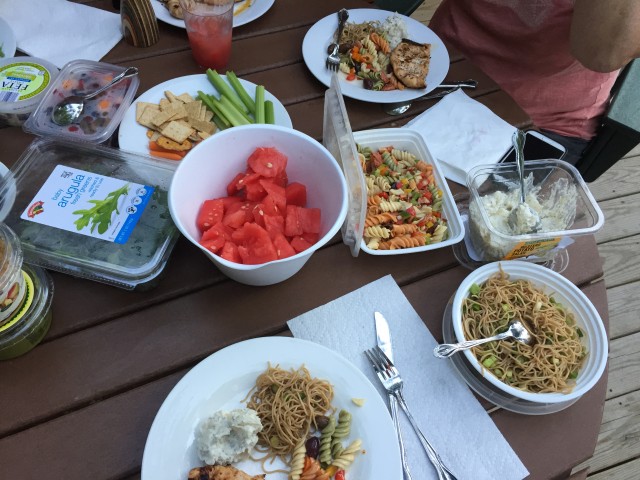 Again, we did our dinner up fancier than our traditional tenting meal. With the convenience of a fridge, stove, sink, and grill, we opted for grilled chicken, a medley of fresh fruit and veggies, all accompanied by a variety of mixed drinks.