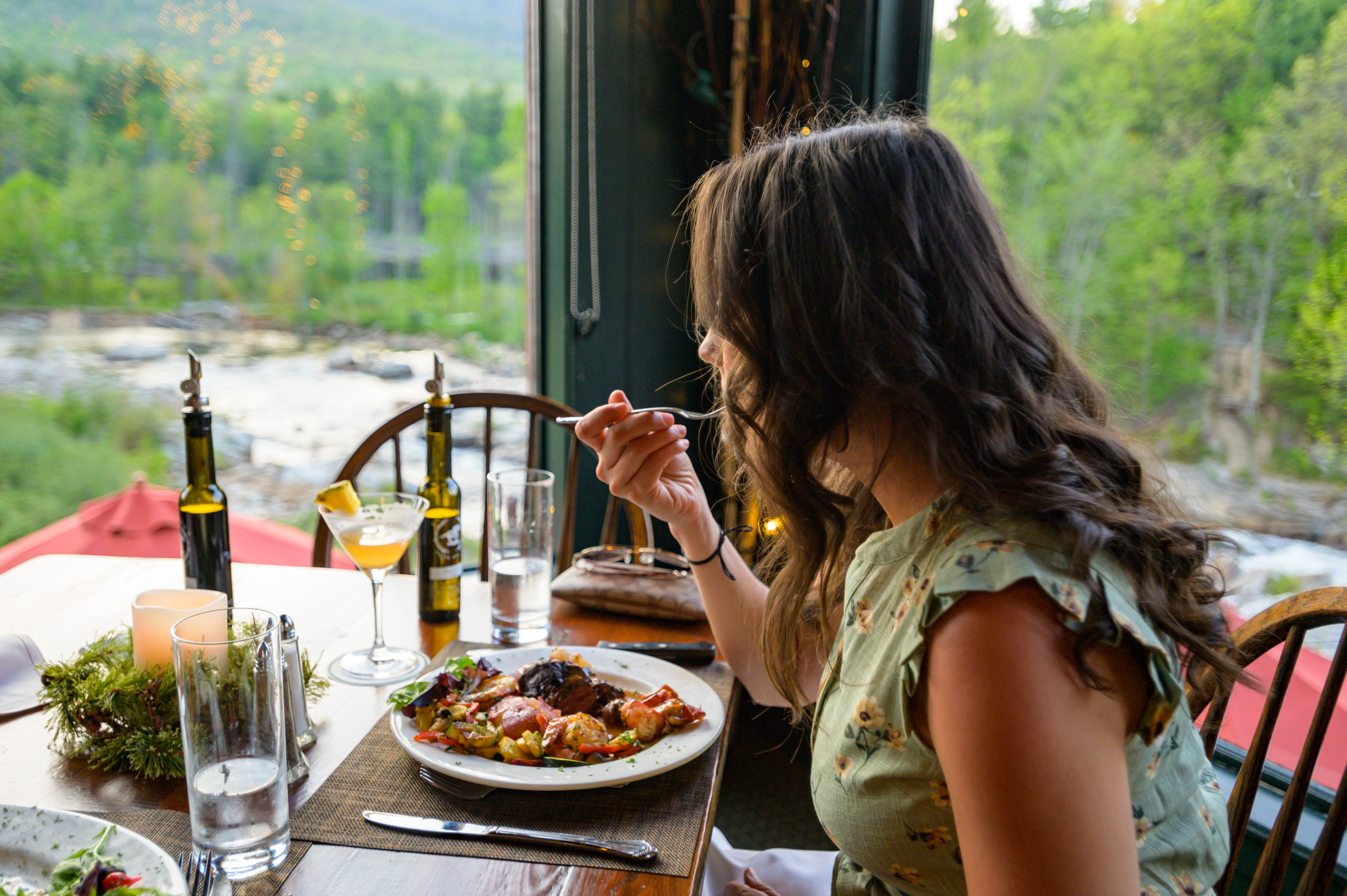 With indoor and outdoor seating options providing views of Whiteface Mountain, poised in all its grandeur beyond the West Branch Ausable River, the location of The Hungry Trout is enough on its own to provide an elegant and tranquil Adirondack evening. My boyfriend and I have spent countless hours exploring and recreating through the Whiteface Region, perpetually in awe of its beauty, but even we found ourselves stunned into silence by this picturesque portrait of our favorite place. We opened the menu to find a sophisticated array of fine dining options to perfectly compliment the restaurant’s ambience. With dishes including steak, chicken, lobster, duck, venison, boar, shrimp, and -- of course -- trout, choosing our selection from the variety of flavors proved to be the only difficulty of the evening. Our wonderful waitress, Tricia, guided us through making our final selections, and we were well on our way to a delicious evening, sipping through hand-crafted cocktails, sharing warm, flavor-filled bites of our steak and seafood entrees -- including the best strip-steak either of us ever had, and satisfying our sweet-tooths with the Maple Crème Brûlée and blueberry cheesecake for dessert. My boyfriend and I normally chat, muse, dream, and solve the world’s problems during our dinner dates, but on this evening, we found ourselves completely content to simply sit with one another, savoring every bite, sharing our dishes, and gazing out upon the world. It was a delectable evening in every possible way.